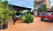 En la zona trasera, tenemos un patio de terrazo moderno desde el cual se puede acceder a un trastero / caseta y a la cocina de la casa.