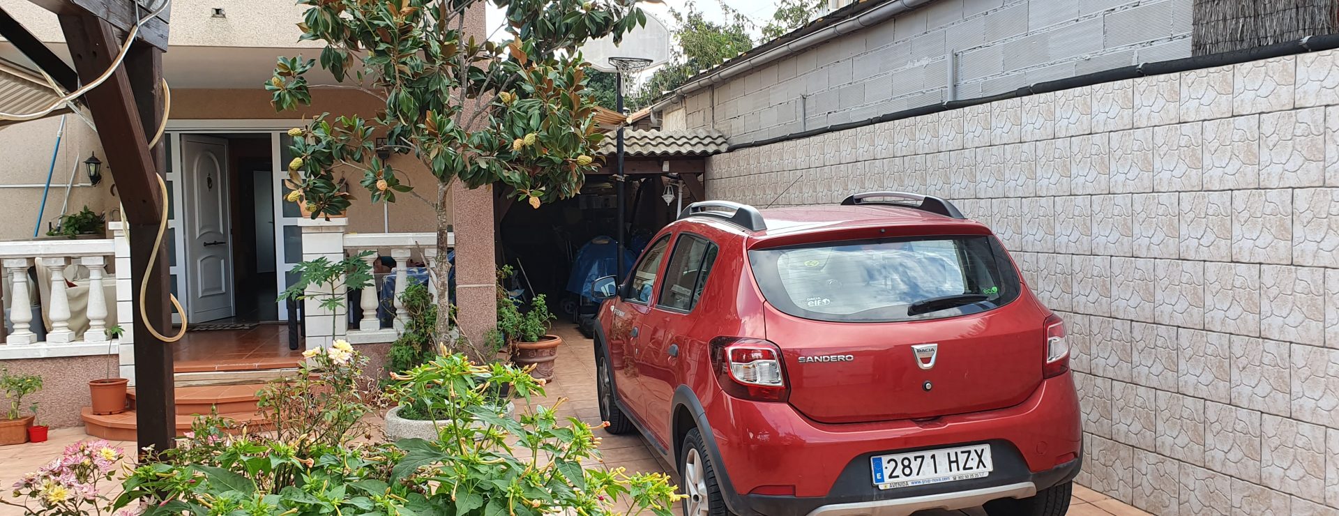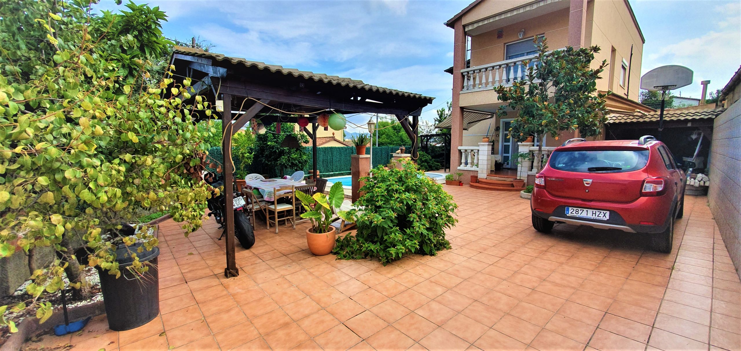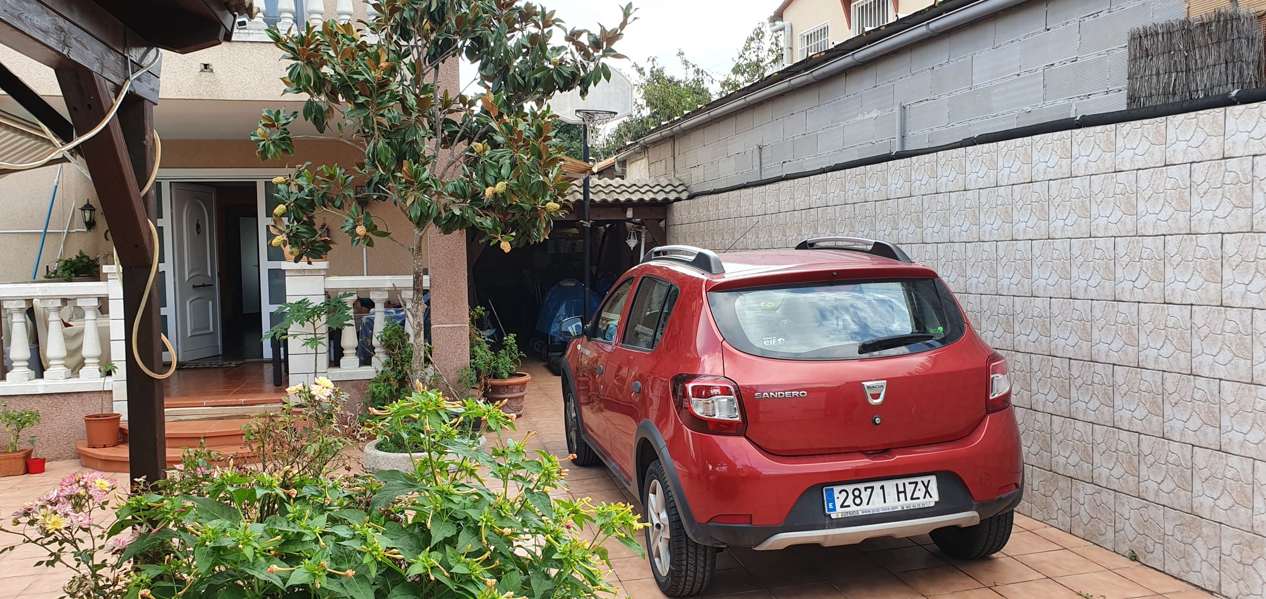 En la zona delantera tenemos la piscina, una zona para barbacoas, y la zona de aparcamiento en la que caben perfectamente 3 coches y varias motocicletas.